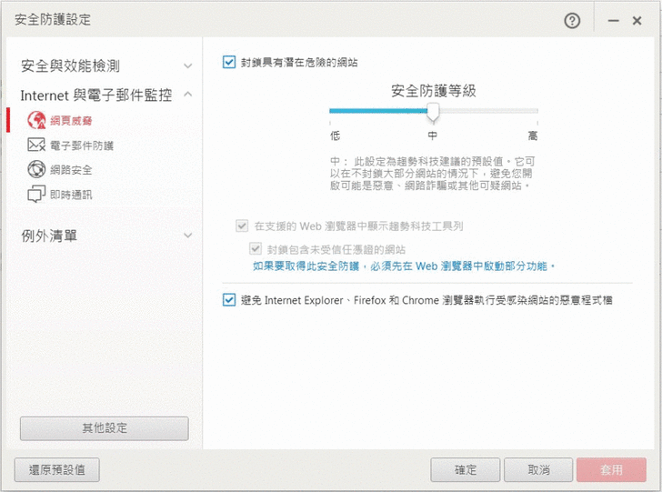 這裡也再細分成「網頁威脅」,「電子郵件防護」,「網路安全與即時通訊」。