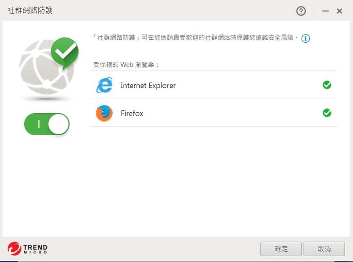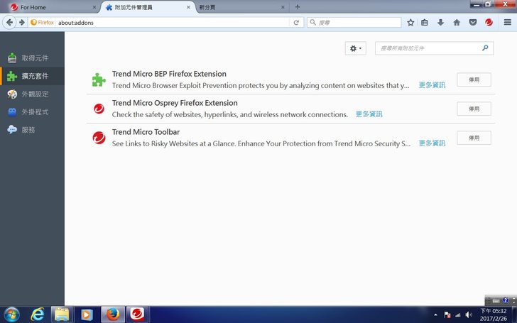 我還是大多依照系統預設值,我只有在網路安全那個選項中,啟動了「防火牆強化精靈」。不過要特別注意的是如果要啟動「網頁威脅」防護,瀏覽器內有關「PC-cillin2017雲端版」的擴充套件都要安裝與打開喔。
