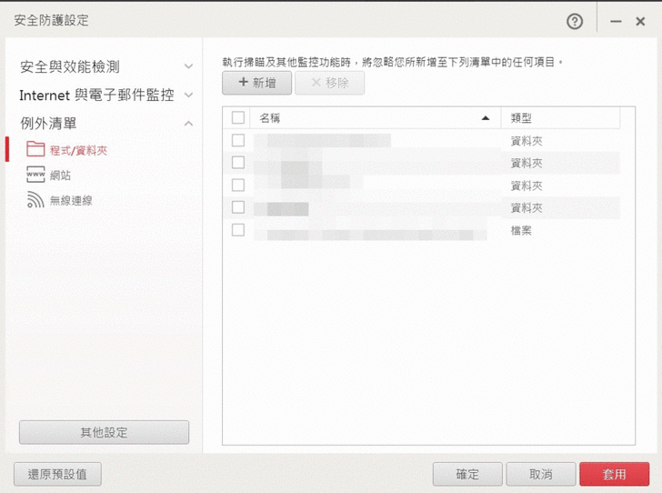 如果你覺得某些程式/檔案夾不需要被掃描,例如你自己拍的照片檔案,你可以設定為例外清單,節省系統掃描時間。