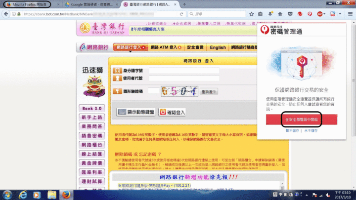 前面有提到「密碼管理通」有提供高安全機制的專屬瀏覽器,哪時候會用得到呢?你連上網路銀行的時候,系統就會自動偵測,提醒你切換到專屬瀏覽器,提高安全性。