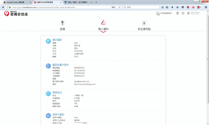 如果在「個人資料」這邊預先填好,以後在一些網站,例如購物網站需要填寫資料的,密碼管理通會幫你自動填入,對搶購限量商品很有幫助。