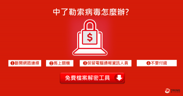 其實你還有其他的選擇,如果勒索病毒已完全感染電腦並將檔案加密,可嘗試趨勢科技勒索病毒檔案解密工具。(在此提醒您,此工具仍在持續改善中,並無法保證能將檔案解密救回。)