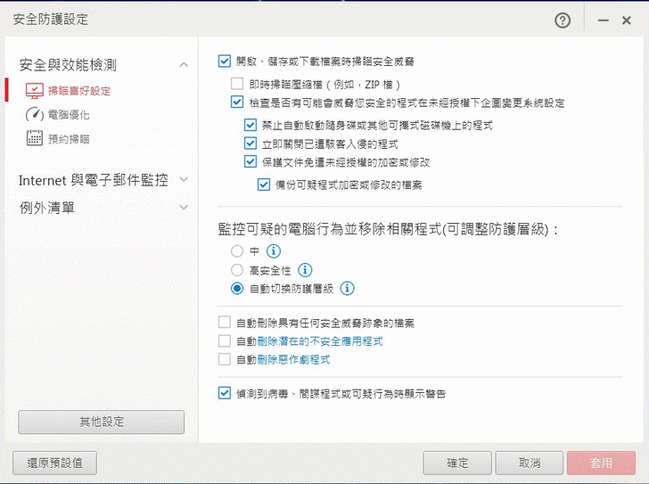 其實照著系統的預設值就好了,只是我個人將「自動刪除具有任何威脅跡象的檔案」的三個勾勾取消,我覺得我還是要知道到底哪個檔案有問題。
