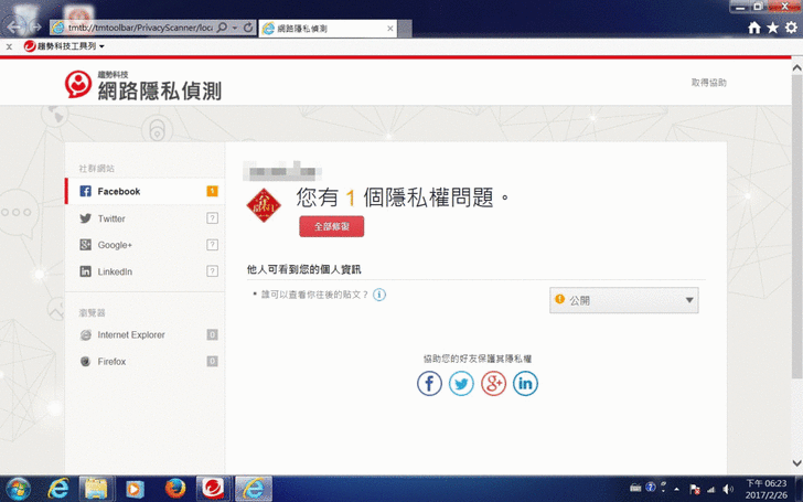 這裡分為「網路隱私偵測」、「社群網路服務」、「私密資料保全」三個選項