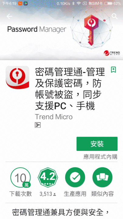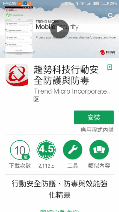 我覺得最困難的步驟居然是在Google Play找軟體,因為你在Google Play中找不到「PC-cillin2017雲端版」,請搜尋並安裝「趨勢科技行動安全防護與防毒」!趨勢科技是不要考慮把產品名稱單一化啊?