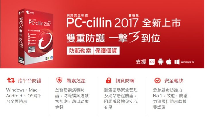 「PC-cillin2017雲端版」則是趨勢科技旗下家用防毒的招牌軟體,除了最基本的防毒功能,我最看中的是他們的雙重防護,也就是防範勒索與保護個資。像我媽這種對資安一竅不通的人,最需要「PC-cillin2017雲端版」的保護。