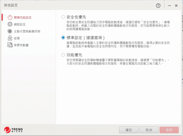 如果你的電腦是最近新買的,電腦效能高,在「開機效能設定」部份,我建議選安全性優先,如果像我的電腦有點年紀,那就選標準設定,盡量不要選效能優先,開機慢個幾秒其實不算什麼啊。