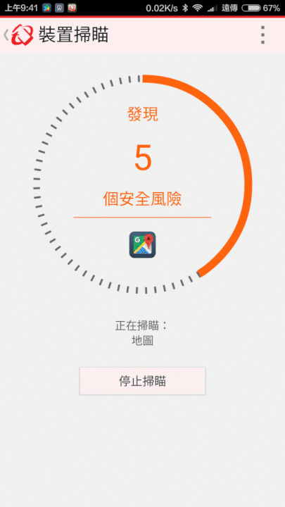 先來看看健檢的結果吧,ㄟ…狀況似乎不好,一個一個的安全風險被掃描出來,不過這只是風險評估,並非一定會出事。最後,從手機中找到20個有風險的APP,其中有「強烈建議解除安裝」,也有「建議解除安裝」。