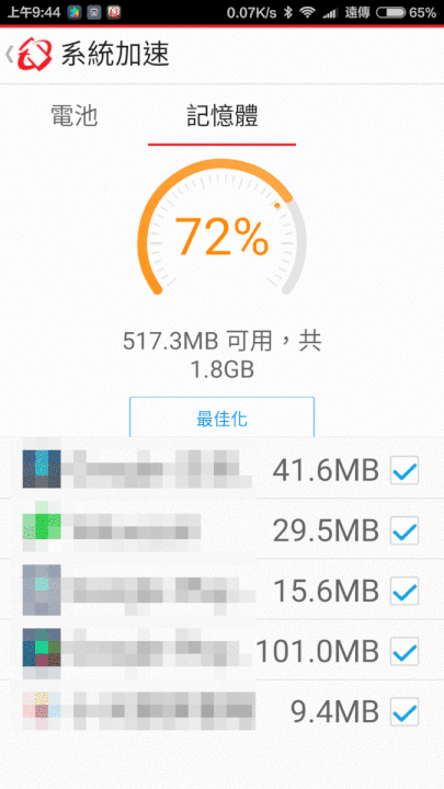 分為「記憶體」與「電池」兩部份,記憶體部份其實就是掃除背景程式暫存,讓記憶體釋放出來,系統可以順暢運行,電池的部份可能是背景程式關閉後可以減少用電量,讓電池可以用久一點。[如果我說的不對,請指正]