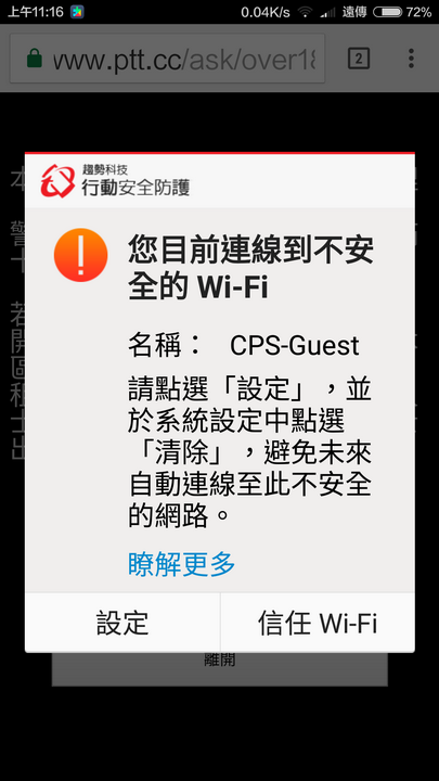 現代人手機大多都有上網吃到飽,但如果你的網路流量用完了,或者收不到手機訊號,必須使用別人的WIFI訊號,如果你看到這個警示,不見得一定有問題,但請你一定要好好檢視一下這個訊號來源是否安全。
