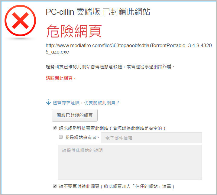 【▼】小傑不相信,直說要試試趨勢PC-cillin 2017雲端版的功能,給了小編一個連結,馬上就被攔截了!由於免空是最容易被散播病毒的點,所以被攔截不意外,若真的確認沒問題,可直接開啟或回報趨勢科技作一個安全審查。