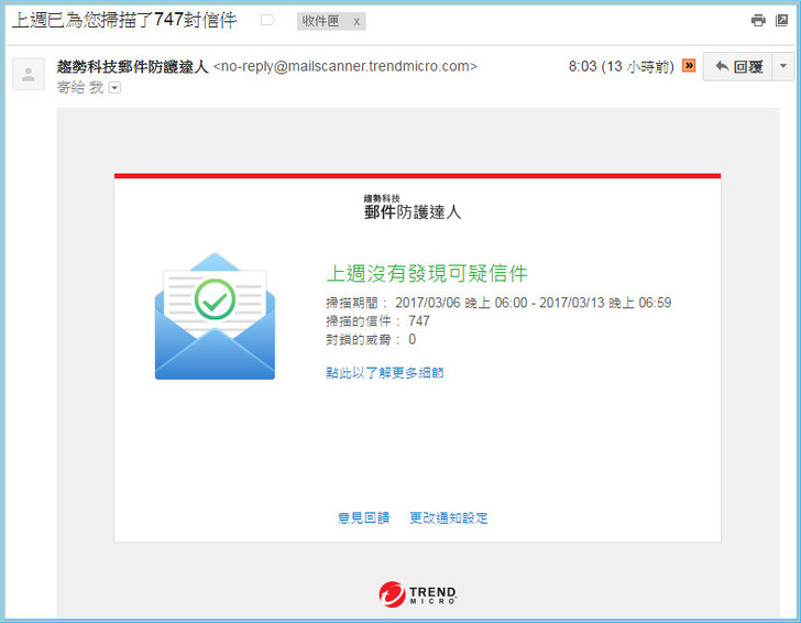 【▼】在電子郵件防護中,趨勢科技郵件防護達人在每週都會例行性檢查您的信件,看有無可疑信件。