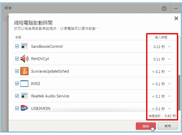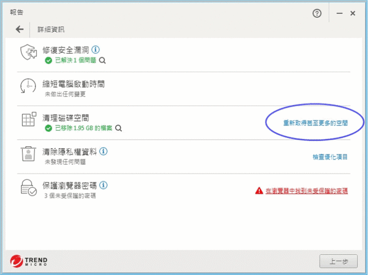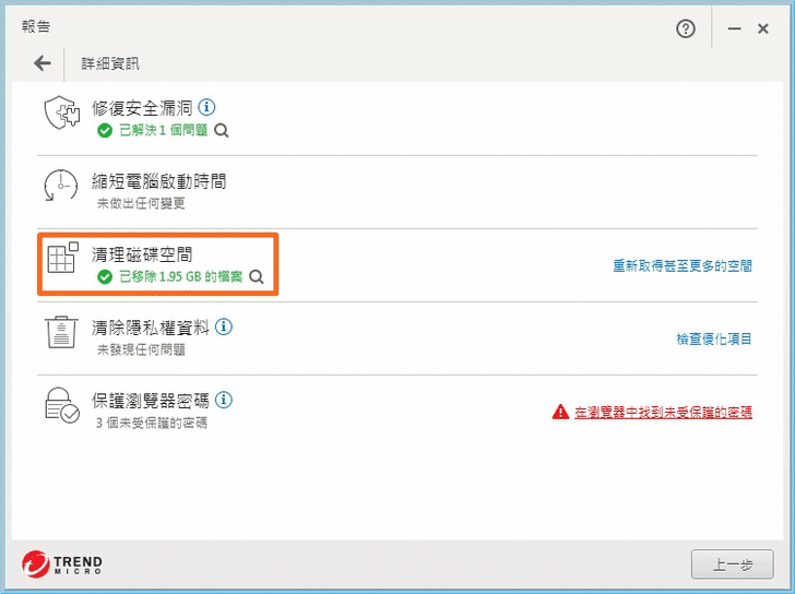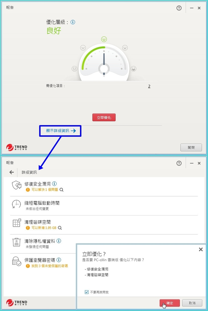 【▼】一開始會先進行目前電腦優化層級的判斷,在綠色笑臉的範圍內,代表目前電腦算順暢,可以不用進行優化,這時可以點選顯示詳細項目,可以針對修補安全漏洞、縮短電腦啟動時間、清理磁碟空間、清除隱私權資料與保護瀏覽器密碼等。修補安全漏洞主要會以最新Windows和Adobe作更新,並開啟內建防火牆。
