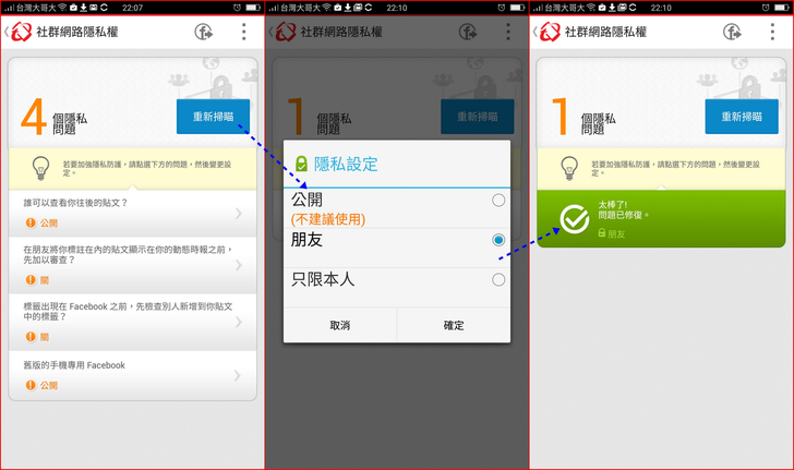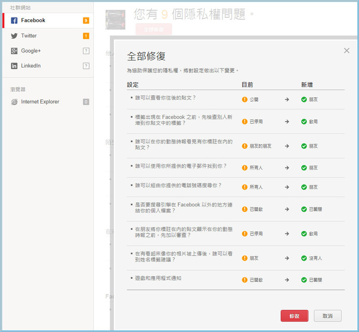 【▼】經過全部修復後,會列出目前與修復後的差異,若覺得朋友還是太公開,也可以自行再變更隱私項目的權限。