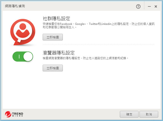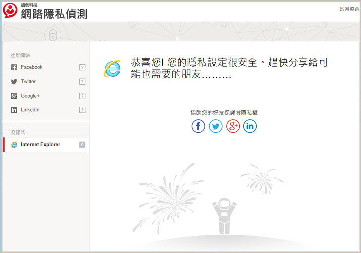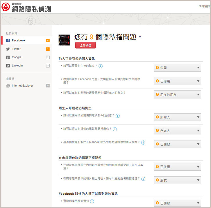 【▼】在網路隱私偵測的部分,可立即檢查社群隱私與瀏覽器隱私設定。