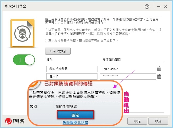 【▼】最後是私密資料的保全,這個工具可保護機密的個人資訊,例如信用卡號或線上服務的密碼。當偵測到有任何嘗試要將受保護的資訊傳送到 Internet 時,無論是傳送到網頁、經由電子郵件或透過即時通訊,系統都會自動阻止傳送。