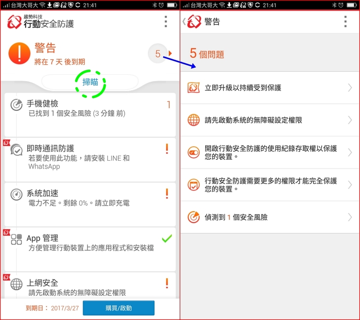 【▼】第一次進入【趨勢科技行動安全防護】主畫面,可感受到介面近人、資訊明確,建議可以先點擊掃描,主畫面會出現安全風險的警告訊息,並提示使用者建議的動作。