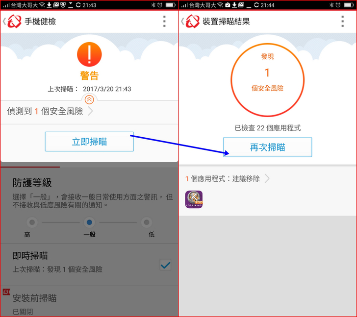 【▼】【趨勢科技行動安全防護】->【手機健檢】,能依照防護等級幫助使用者掃瞄出有疑慮的App,像小編都習慣從Google Play下載,不過還是掃描到一個,是否誤判?小編不敢說,但也不會幫你直接刪除,保留了讓使用者自行移除的彈性。