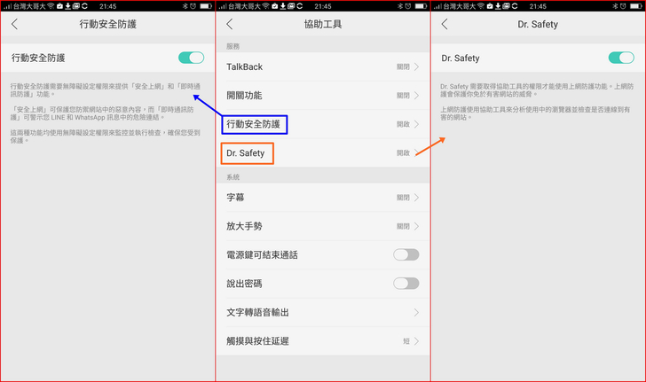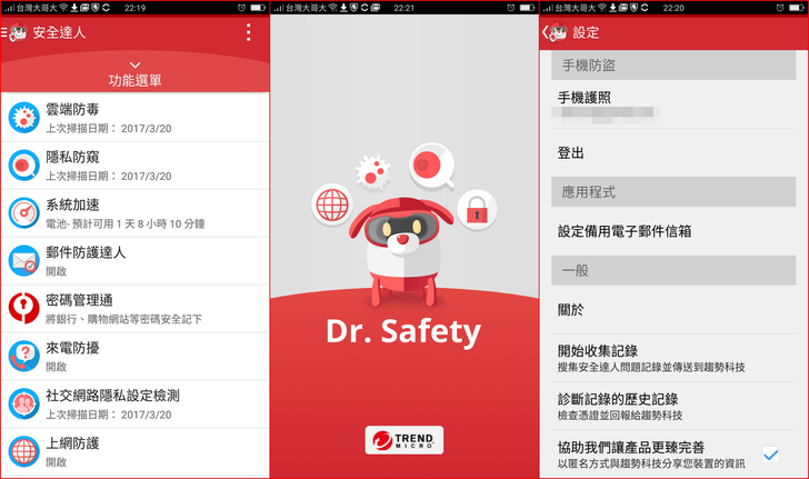 【▼】這邊要再提示一下大家,在安裝完【趨勢科技行動安全防護】與【趨勢安全達人】時,在行動裝置內的協助工具會多出行動安全防護與Dr.Safety,這邊設定要記得將其開啟。