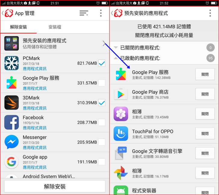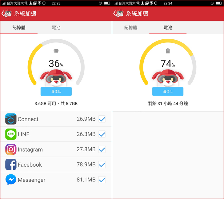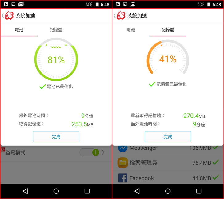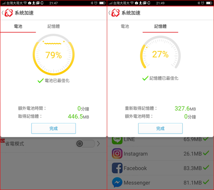 【▼】【系統加速】能顯示各應用App所占用的記憶體大小,並針對記憶體能釋放出更多的容量,而電池也能最佳化,讓電池撐得更長久。
