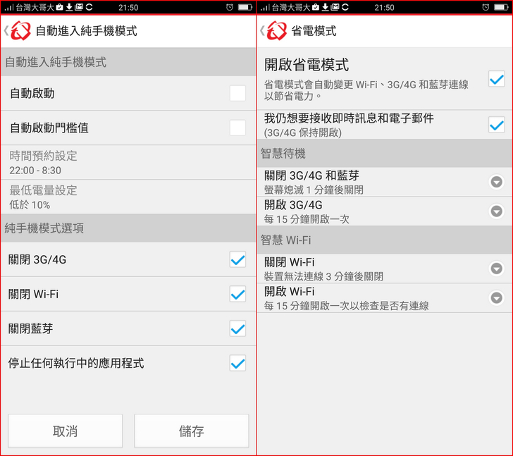 【▼】純手機模式與省電模式的相關設定,能各別針對3G/4G、Wi-Fi、藍芽作設定,除非真的網路環境很差,只能收到3G通信訊號,不然還是不建議切換成純手機或省電模式,以免將智慧型手機的功能給埋沒掉了。