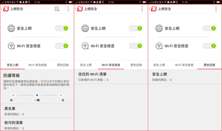 【▼】【趨勢科技行動安全防護】->【上網安全】,提供了各種防護等級的安全上網、黑白名單的設定,針對周遭環境的免費Wi-Fi,也可以進行安全檢查,避免遭到有心駭客的入侵!