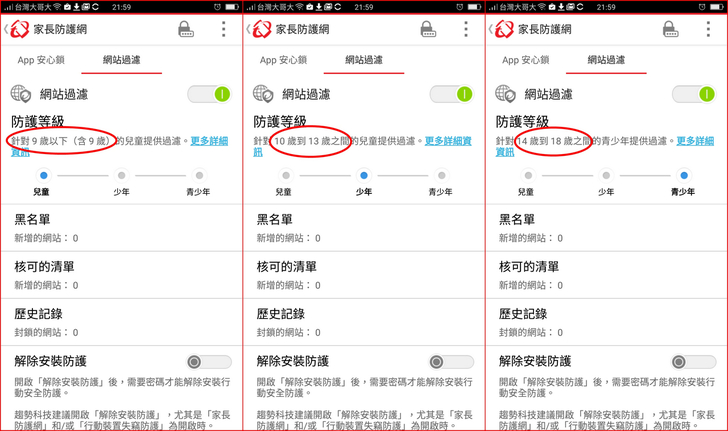 【▼】【家長防護網】中的網站過濾能依照不同年齡層(含9歲以下兒童、10-13歲的少年以及14-18歲的青少年)作不同程度的防護等級,若是像暴力與色情的網站,就可直接列入黑名單中。