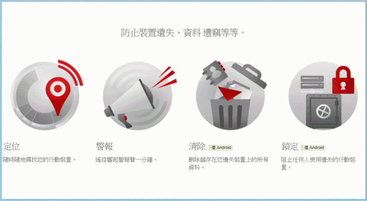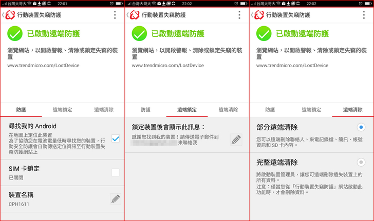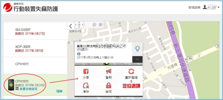 【▼】首先一定要先定位,這時就要保佑您的行動裝置GPS定位沒被關掉,【行動裝置失竊防護】提供了分享GPS位置、發出警報聲、清除行動裝置內資料與裝置鎖定。
