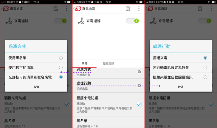 【▼】【趨勢科技行動安全防護】->【來電過濾】,這功能就有點像是whos call,能幫你過濾可疑電話,過濾方式有自訂黑白名單或允許匿名來電等,而處理方式則有拒接、來電自動轉靜音或是自動回覆簡訊等。