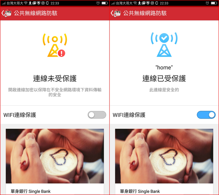 【▼】當連線未受保護時,會呈現橘紅色的警示,而安全連線受保護時則呈現藍色。