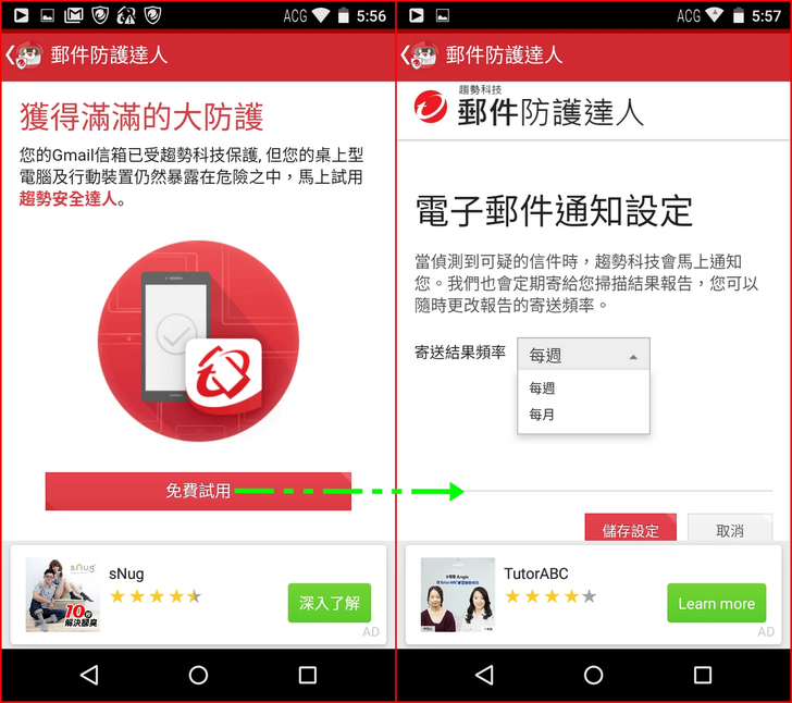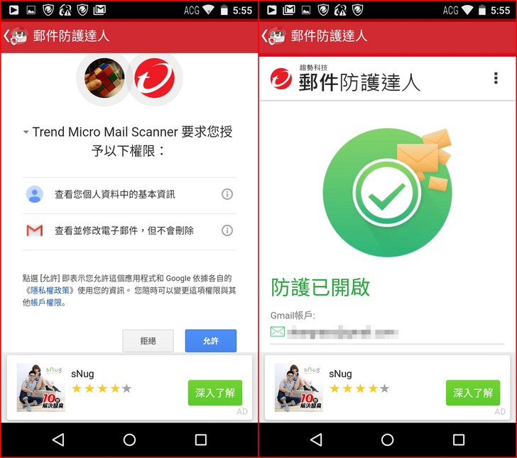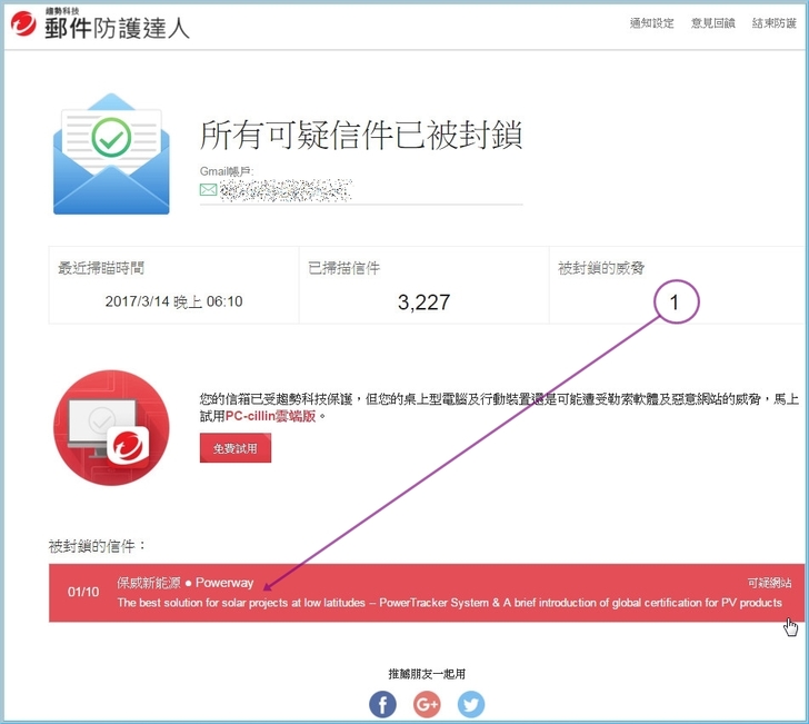 【▼】【安全達人】->【郵件防護達人】,能防護線上E-mail,小編這邊已Gmail作示範,首先會要求您授權給趨勢科技,允許後就能開啟防護。