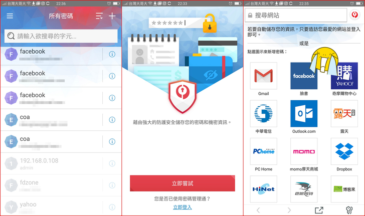 【▼】在【安全達人】->【密碼管理通】,雖然是整合在【安全達人】App中,但實際上還是要另外安裝,這是一套能幫你自動儲存各網的密碼資訊站套件,預設網站有常見的Gmail、臉書、奇摩購物、露天拍賣、PChome與巴哈姆特等。