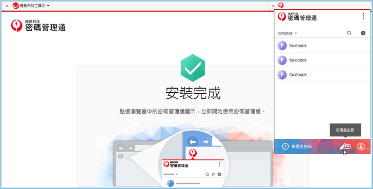 【▼】也許您會問這與一般功能瀏覽器儲存密碼的功能有何差異?若你是多人共用的電腦時,若您在瀏覽器中儲存帳密,之後每個人都可以利用您的帳密來登入,這是非常危險且不智的作為,而且瀏覽器常會有漏失cookies的情況發生。【密碼管理通】除了能幫你記錄各網站的密碼之外,還能幫你檢查你的密碼強度,甚至亂數幫你產生安全密碼,不僅支援Windows連Mac用戶也沒有問題!