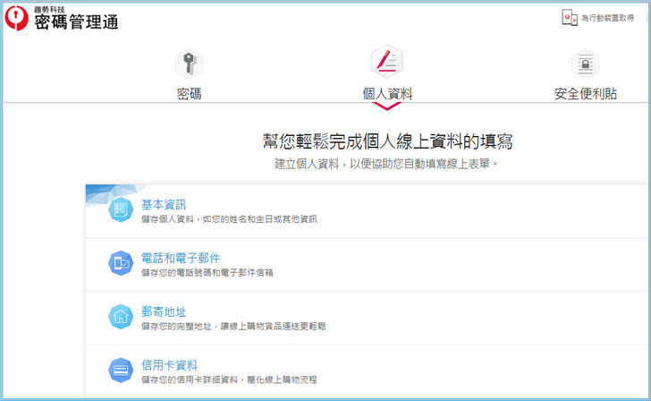 【▼】在密碼管理通的個人資料頁面,能將您預先儲存的姓名、住址、電話號碼等個人資訊,自動帶入購物網頁的表單,對於購物網站購買商品時,方便您快速完成購買流程。