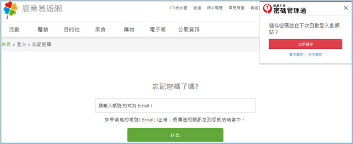 【▼】小編以農業易遊網登入畫面作示範,馬上就跳出密碼管理通問您要步要儲存密碼,是即時的唷~