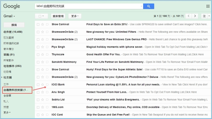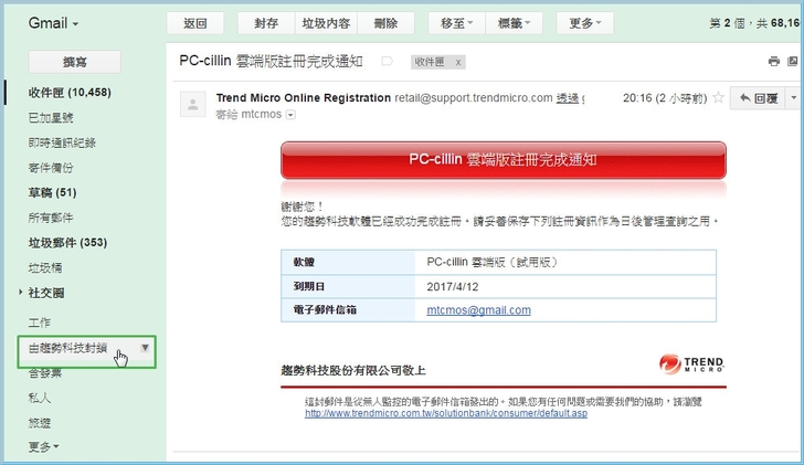 【▼】在安裝完趨勢PC-cillin 2017雲端版後,在Gmail的群組內多自動多出一組名為由趨勢科技封鎖的群組。