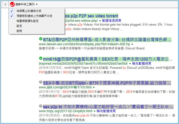 【▼】另外像使用谷哥大神查詢,也會出現綠色勾勾與灰色不明問號,分別代表不同的連結分級,當然這只是參考,不是說綠色連結就不會有問題,趨勢PC-cillin 2017雲端版能幫你固守第一道的防線。