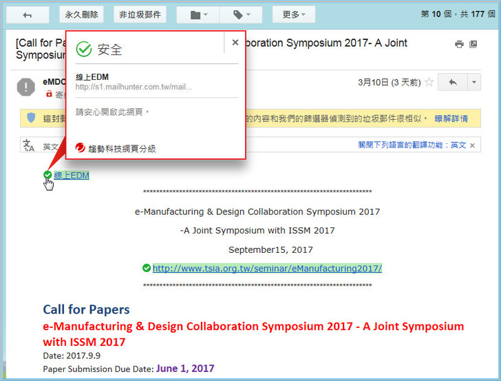 【▼】在E-mail上面的連結一樣會顯示安全分級,真的讓人安心不少。