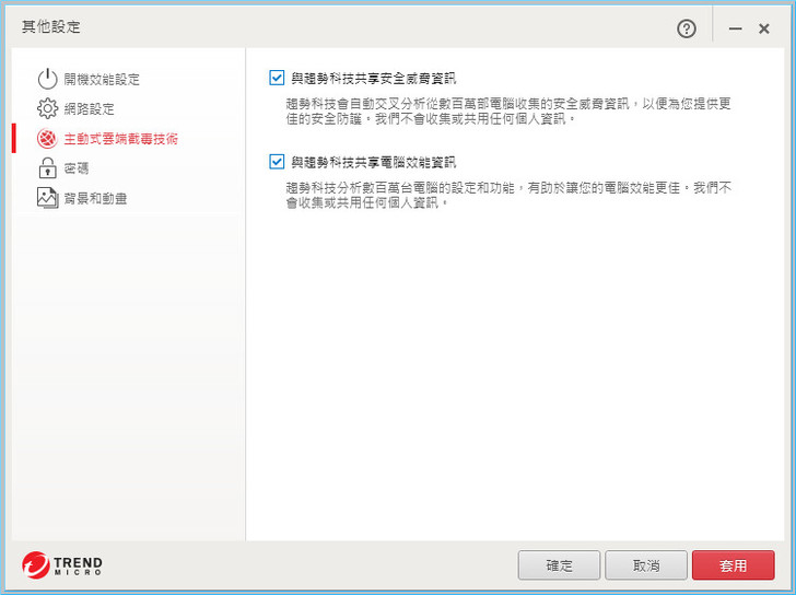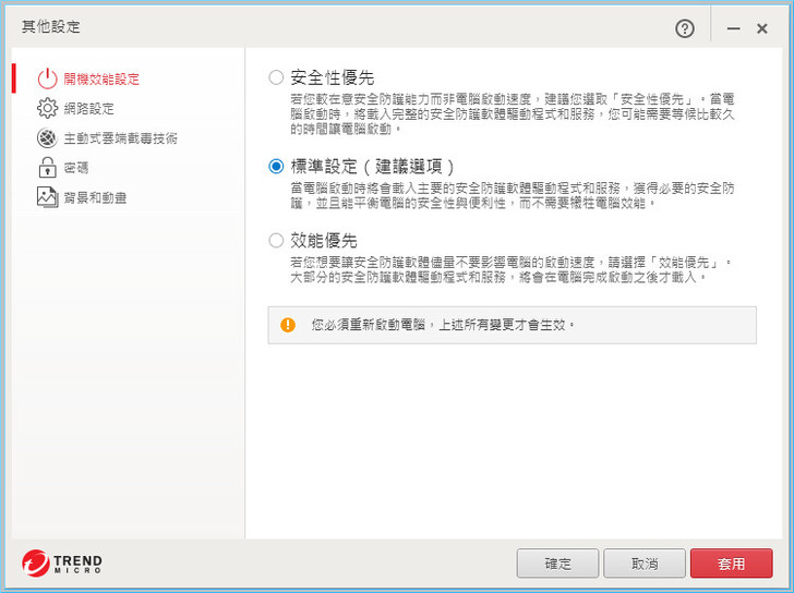 【▼】在趨勢PC-cillin 2017雲端版整體設定部分,有開機效能設定,有的用戶不上網,要上網再連線,建議可以以效能優先。