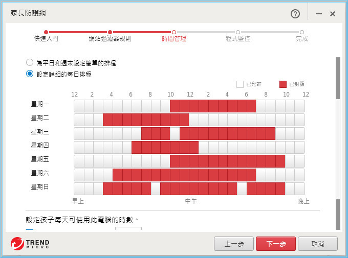 【▼】而大姊最Care的時間管理,就是在第三步驟,這邊能從星期一到星期日24小時作各別的設定,紅色就是代表封鎖不能用的時段,看來大姊對阿達還是相當嚴苛阿...