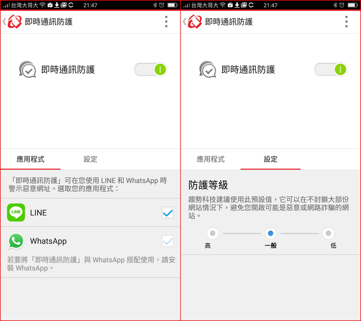 【▼】【趨勢科技行動安全防護】->【即時通訊防護】,能針對時下最流行的兩套即時通訊軟體:LINE、WhatApp進行惡意連結的警示,防護等級一般即可,若防護等級調至最高,可能群組內的的老人圖都不復見啦...XDDD