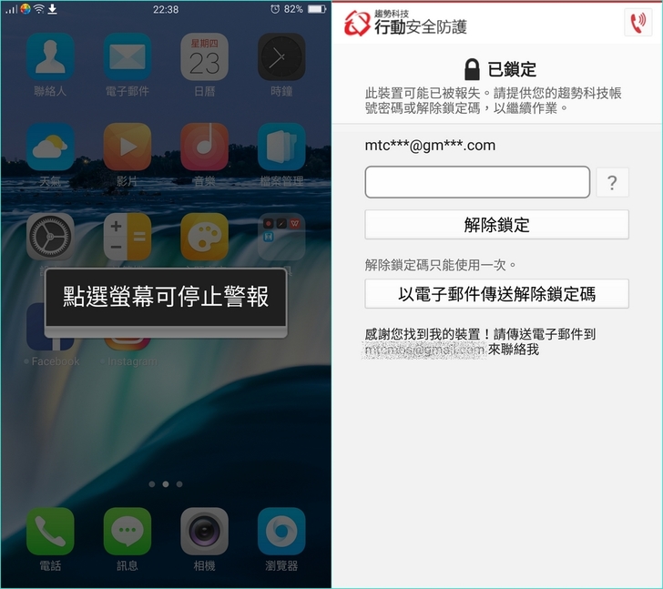 【▼】而發出警報聲會自動將聲音調至最大聲,不過點選螢幕就能暫停聲響,比較沒有嚇阻效果,其實比較適合手機在附近遺忘而不是真正遺失時來使用;而裝置鎖定能鎖定控制權,不過小編發現有小Bug,就是透過緊急撥打電話,快速呼出記憶體清理工具,就能解除鎖定,提供給趨勢科技知悉,若有必要,可詳情來信小編再告知細節。