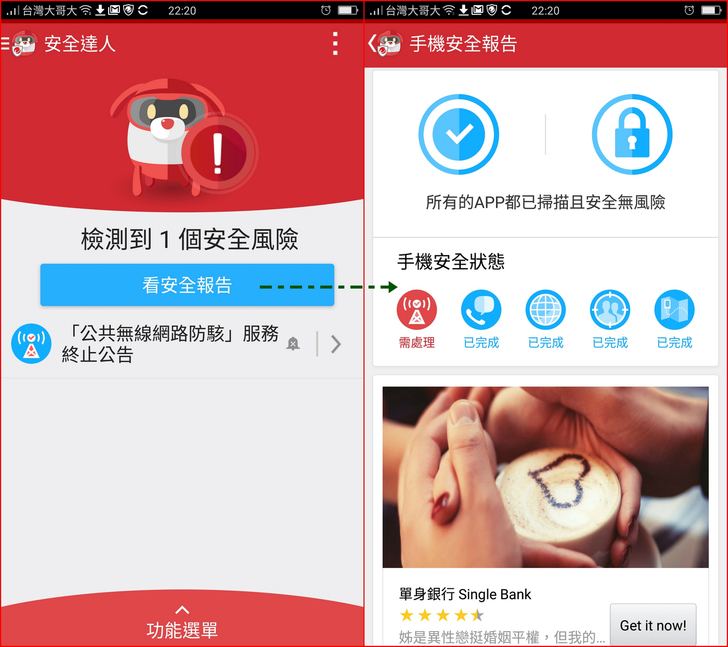 【▼】啟動【安全達人】後,【安全達人】也會自動偵測行動裝置上的安全風險,藍色代表安全,紅色就是需要處理的地方。
