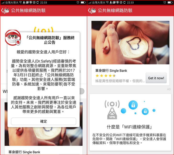 【▼】【安全達人】最讓人稱道的【公共無線網路防駭】竟然於3/31要終止,這讓眾玩家相當不捨,希望趨勢高層能再多加考量,畢竟現在網路吃到飽還是很貴,公共Wi-Fi還是偶爾會用到的。有此服務就能保障手機隱私與安全。