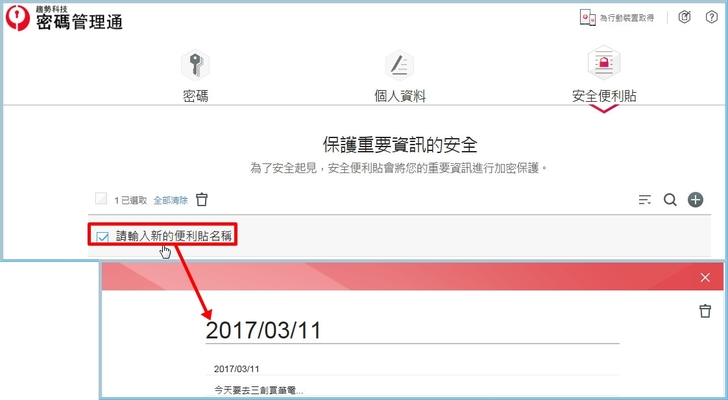 【▼】而在密碼管理通的安全便利貼是什麼呢?這是一種將機密資訊安全地儲存在安全便利貼中,並可在安裝密碼管理e指通的所有裝置上保持同步。目前僅 Windows 版的密碼管理e指通提供此功能。
