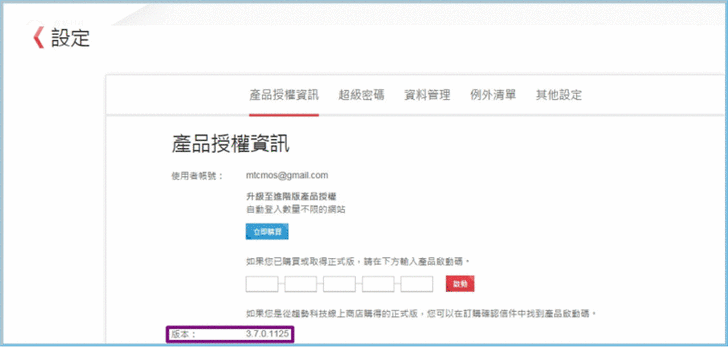 【▼】在密碼管理通的主設定上,有產品授權資訊,若有序號可直接輸入成為完整版,在超級密碼詢問的時間點與例外清單也可以另外設定,最後能匯出與匯入供其他裝置使用,可同步支援多種上網裝置,不限安裝台數。