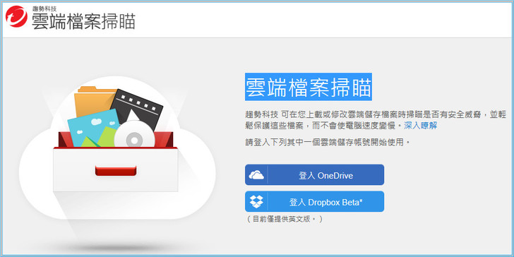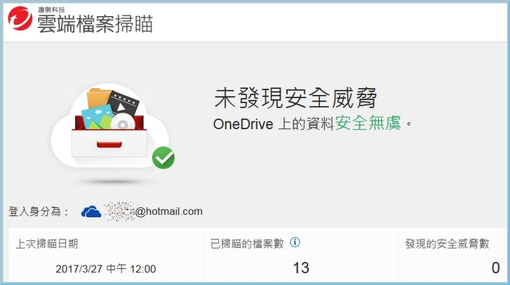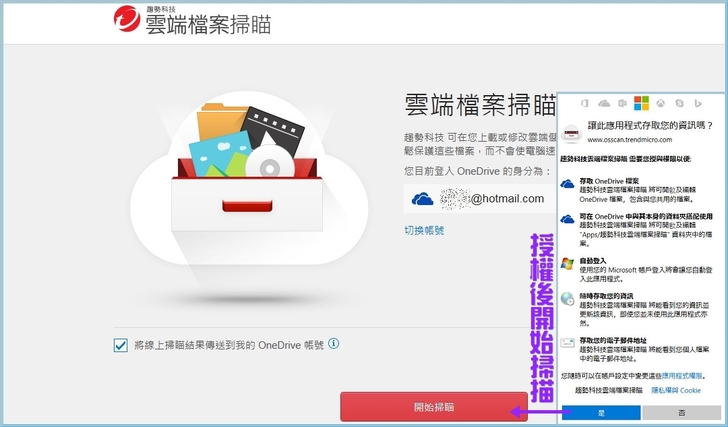 【▼】首次登入OneDrive需授權給https://www.osscan.trendmicro.com/,並開始掃描檔案,雲端檔案掃瞄可以掃瞄儲存在 Microsoft OneDrive 上安全威脅,而不會影響您的電腦使用效能,並隔離刪除所有包含威脅的檔案。由於此掃瞄功能是在雲端進行,因此您可隨時關閉您的電腦而不影響此掃瞄功能與過程。