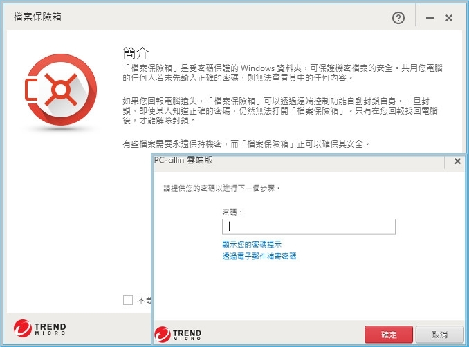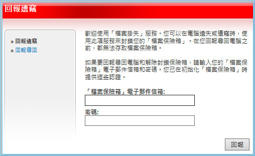 【▼】檔案保險箱的設中還有機密檔案掛失,當您的電腦遺失或遭竊,請立即透過「檔案掛失」服務封鎖保險箱。如果要存取此服務,您需要在初始化期間所提供的電子郵件信箱和密碼。在回報電腦遺失後,「檔案保險箱」會在桌面上消失並自動封鎖保險箱。除非您回報電腦已找回,否則沒有任何人可以開啟已封鎖的「檔案保險箱」。
