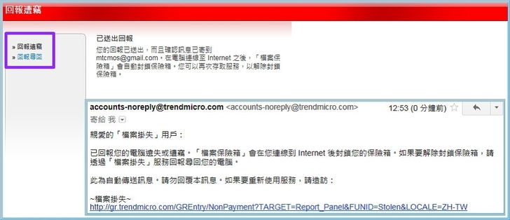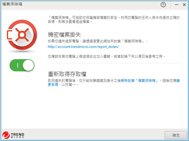 【▼】只要遺失電腦已連線到 Internet,「檔案保險箱」會定期聯絡趨勢科技以檢查您電腦的狀態。如果您已回報電腦遺失或遭竊,只要下次「檔案保險箱」連線檢查時,保險箱就會從桌面上消失並立即被封鎖。若電腦已找到,記得到「檔案掛失」服務回報電腦已尋回。