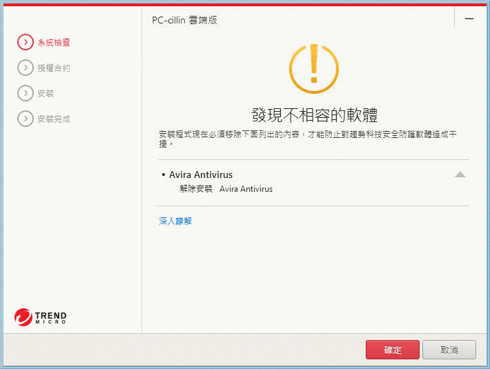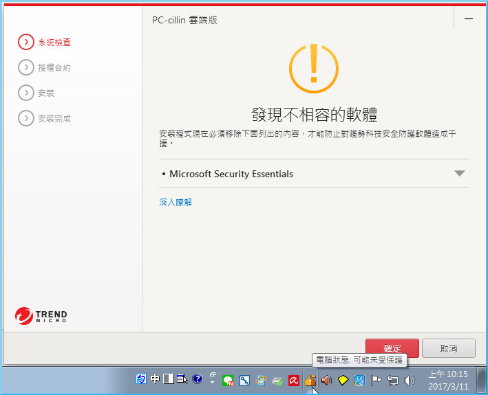 【▼】解壓縮後會來到系統檢查的步驟,這邊由於阿傑先前有安裝微軟的MSE,經檢查後為不相容趨勢PC-cillin 2017雲端版,建議先行移除,以免相衝。